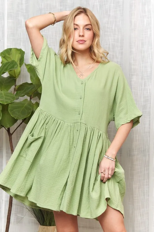 V-Neck Half Sleeve Dress with Pockets – Dusty Green