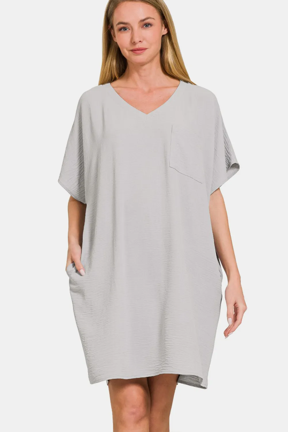 The V-neck tee dress with pockets is a comfortable and versatile piece that combines style and convenience. The V-neckline adds a touch of femininity to the classic tee dress silhouette. With the addition of pockets, this dress offers both practicality and a casual-chic vibe. Perfect for on-the-go days, you can easily store small essentials in the pockets while keeping your hands free. Whether dressed up with accessories or worn casually with sneakers, this dress is a versatile and effortless choice for any occasion. Stay stylish and comfortable with the V-neck tee dress featuring convenient pockets.