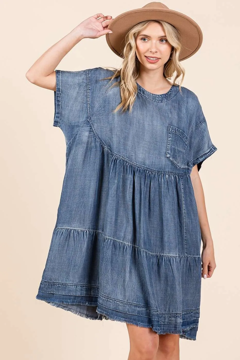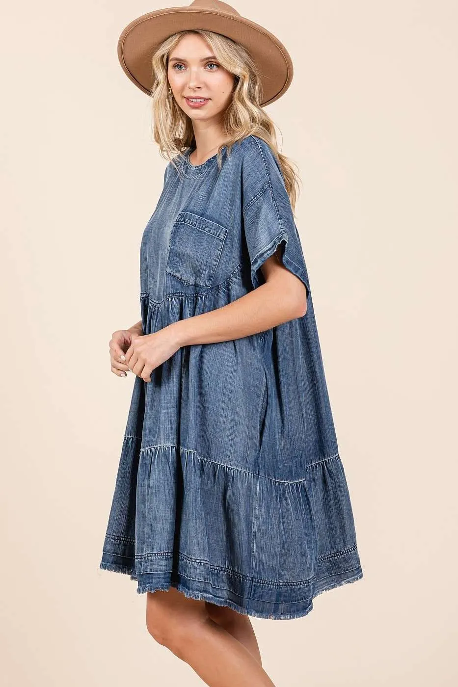 This washed chambray denim oversized tier mini dress is a trendy and relaxed addition to your wardrobe. The oversized fit offers a comfortable and laid-back look, while the tiered design adds a touch of boho-chic style. Stay effortlessly cool and stylish in this versatile mini dress.