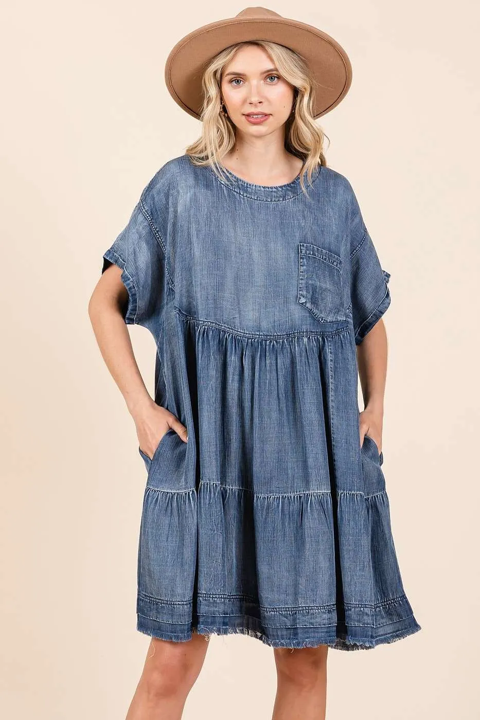 Washed Chambray Denim Oversized Tier Mini Dress – Medium