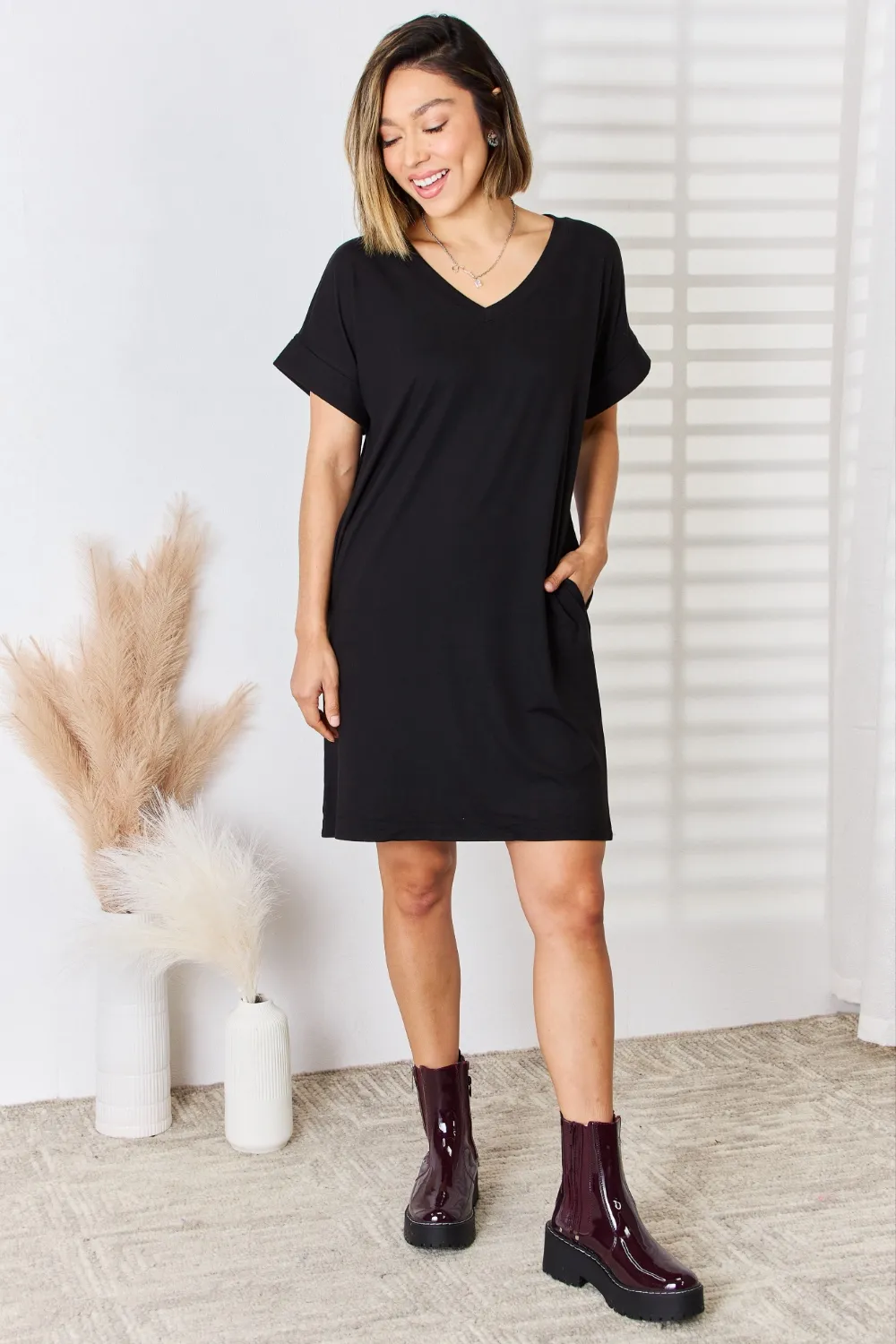 Full Size Rolled Short Sleeve V-Neck Dress – Black