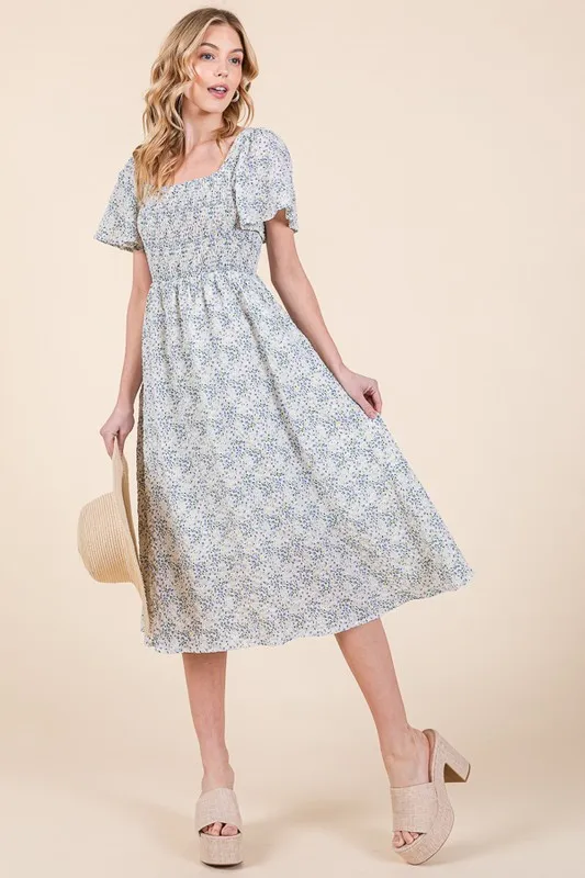 Smocked Floral Print Flutter Sleeve Midi Dress – White